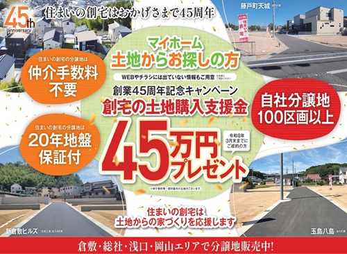2026.01.12. お知らせ 《45周年記念》土地購入支援金45万円プレゼント! 住まいの創宅、創業45周年記念キャンペーン!創宅の土地と注文住宅をご契約の方に、土地購入費として45万円を支援いたします。 前の記事へ 記事一覧へ